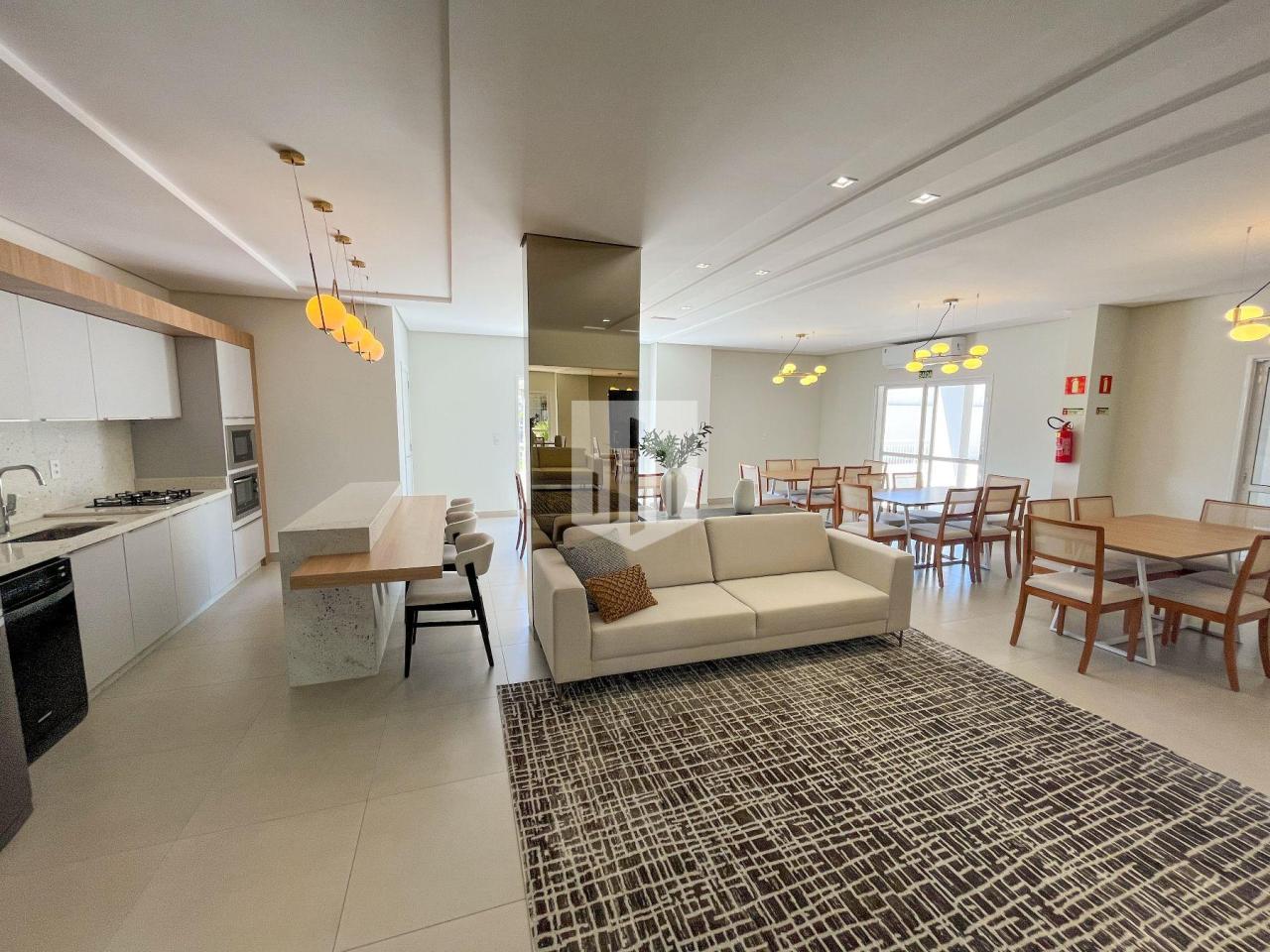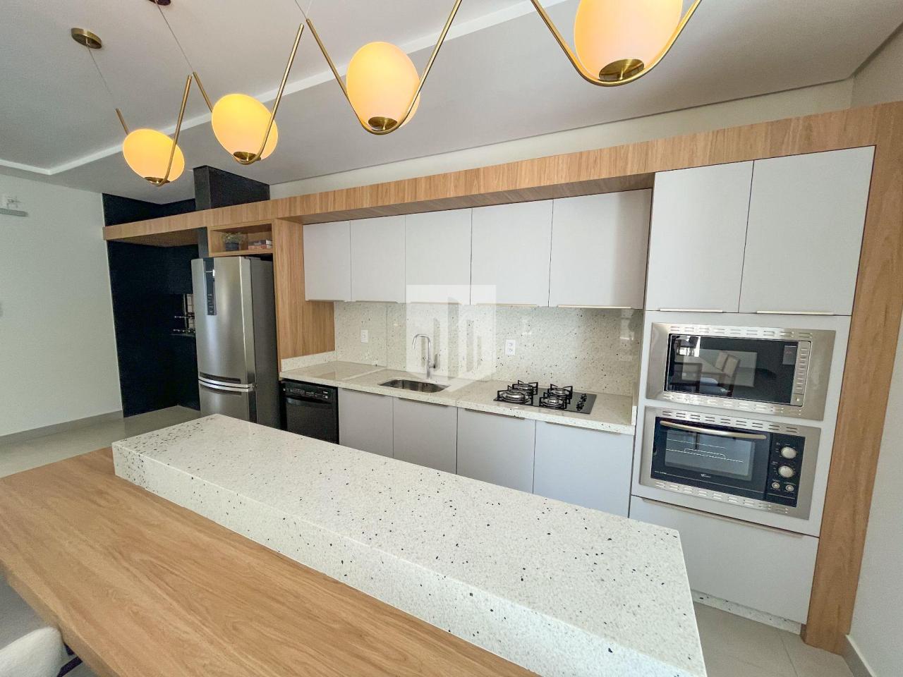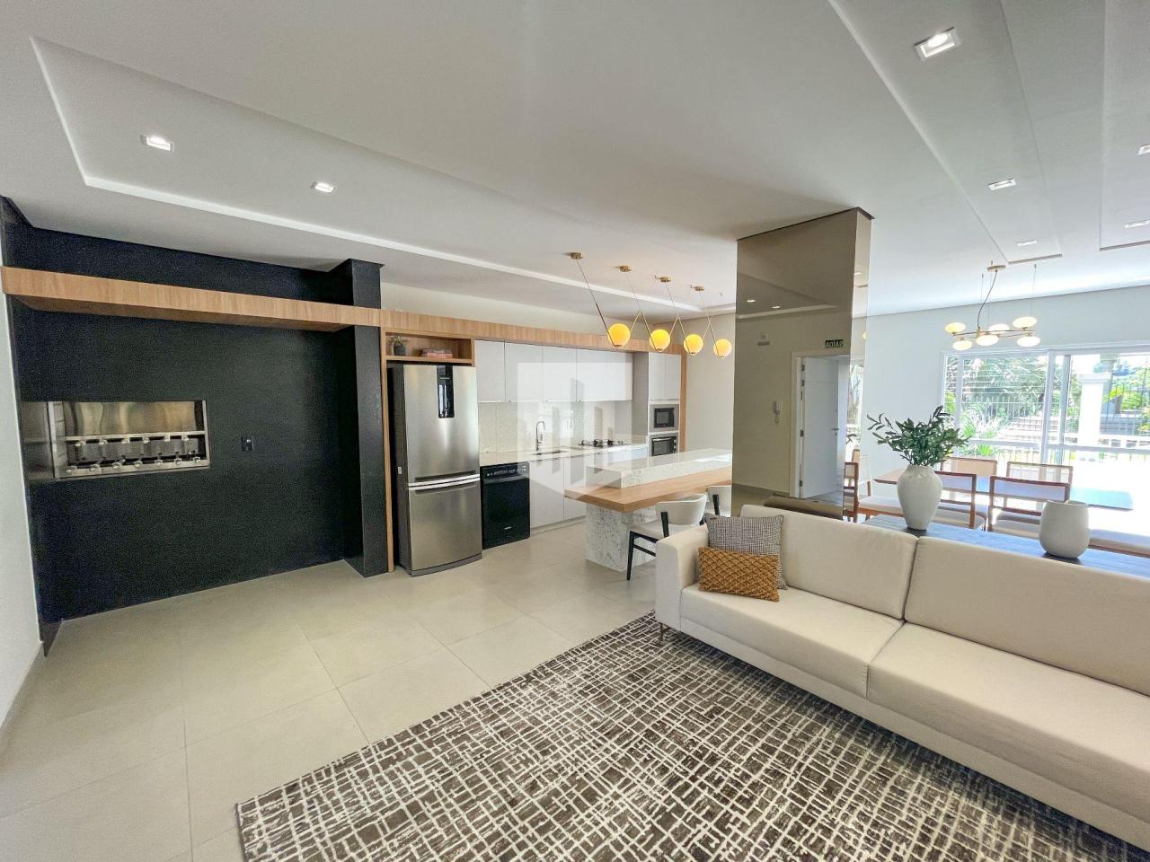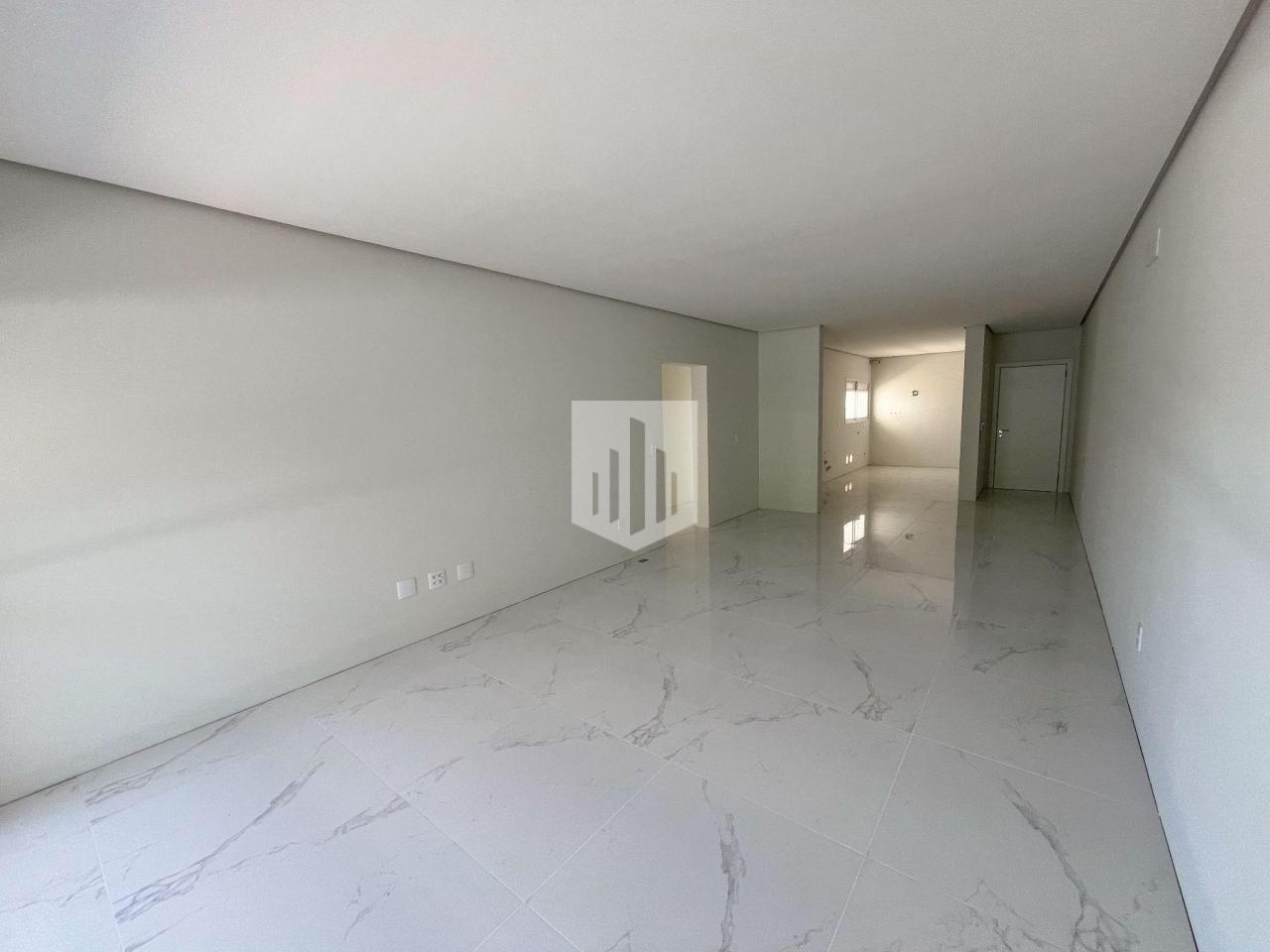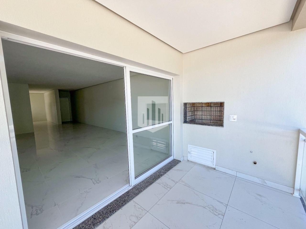Apartamento com 129,58m² de área privativa, que conta com três dormitórios, um deles suíte, um banheiro social, sala de estar, jantar e cozinha em ambientes integrados, área de serviço, duas vagas de estacionamento cobertas e ampla sacada com churrasqueira.