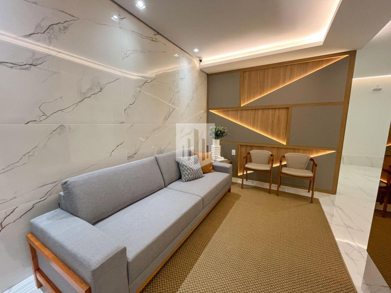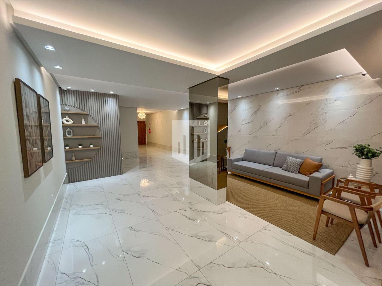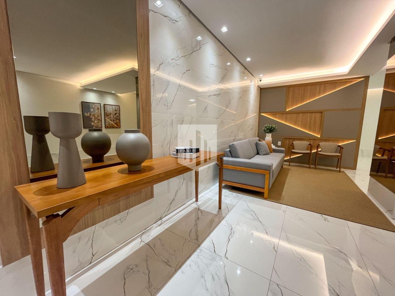 Condomínio com hall de entrada decorado, salão de festas mobiliado, ambiente de lazer, elevador, interfone, gás canalizado e medidores individuais de água, luz e gás.