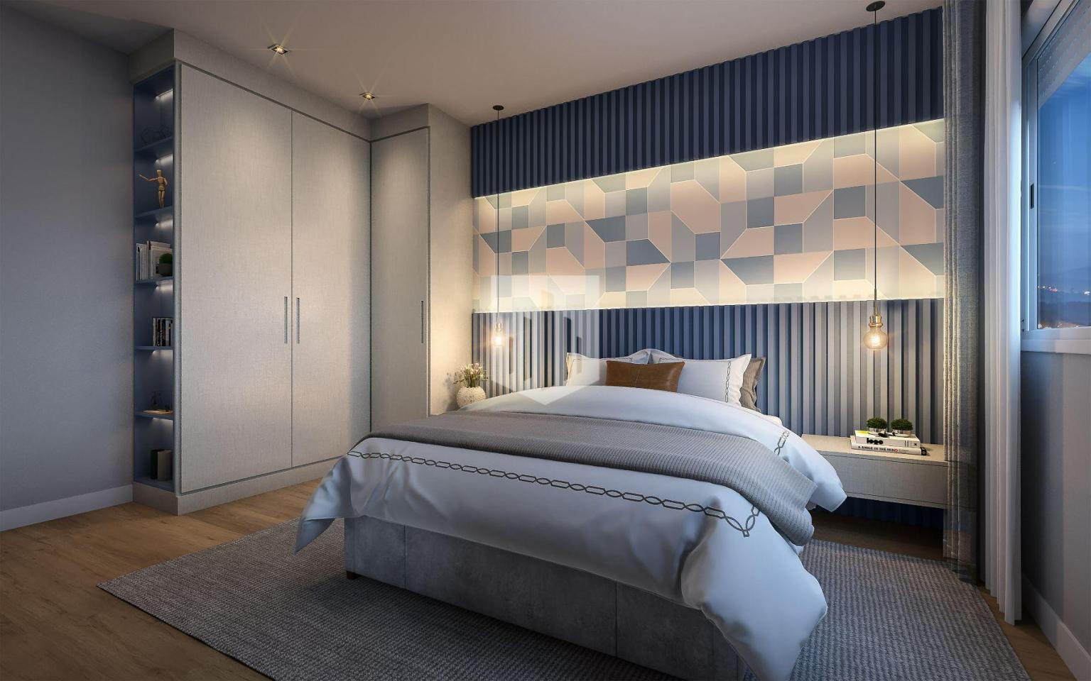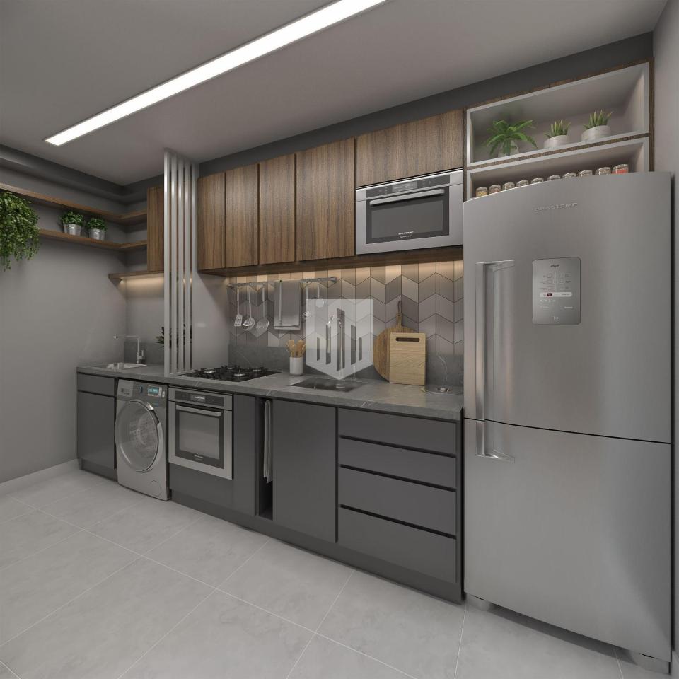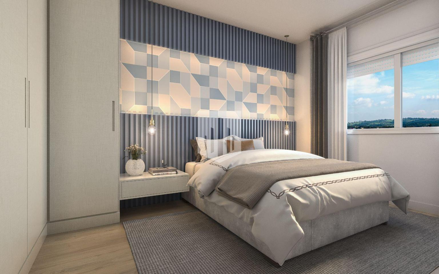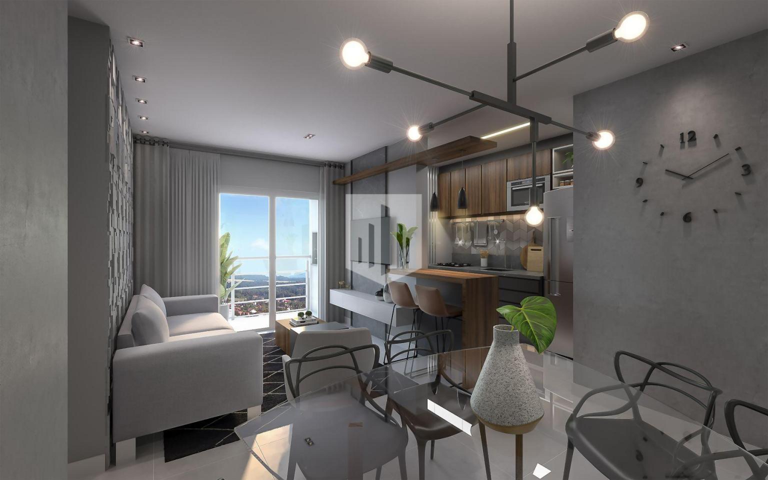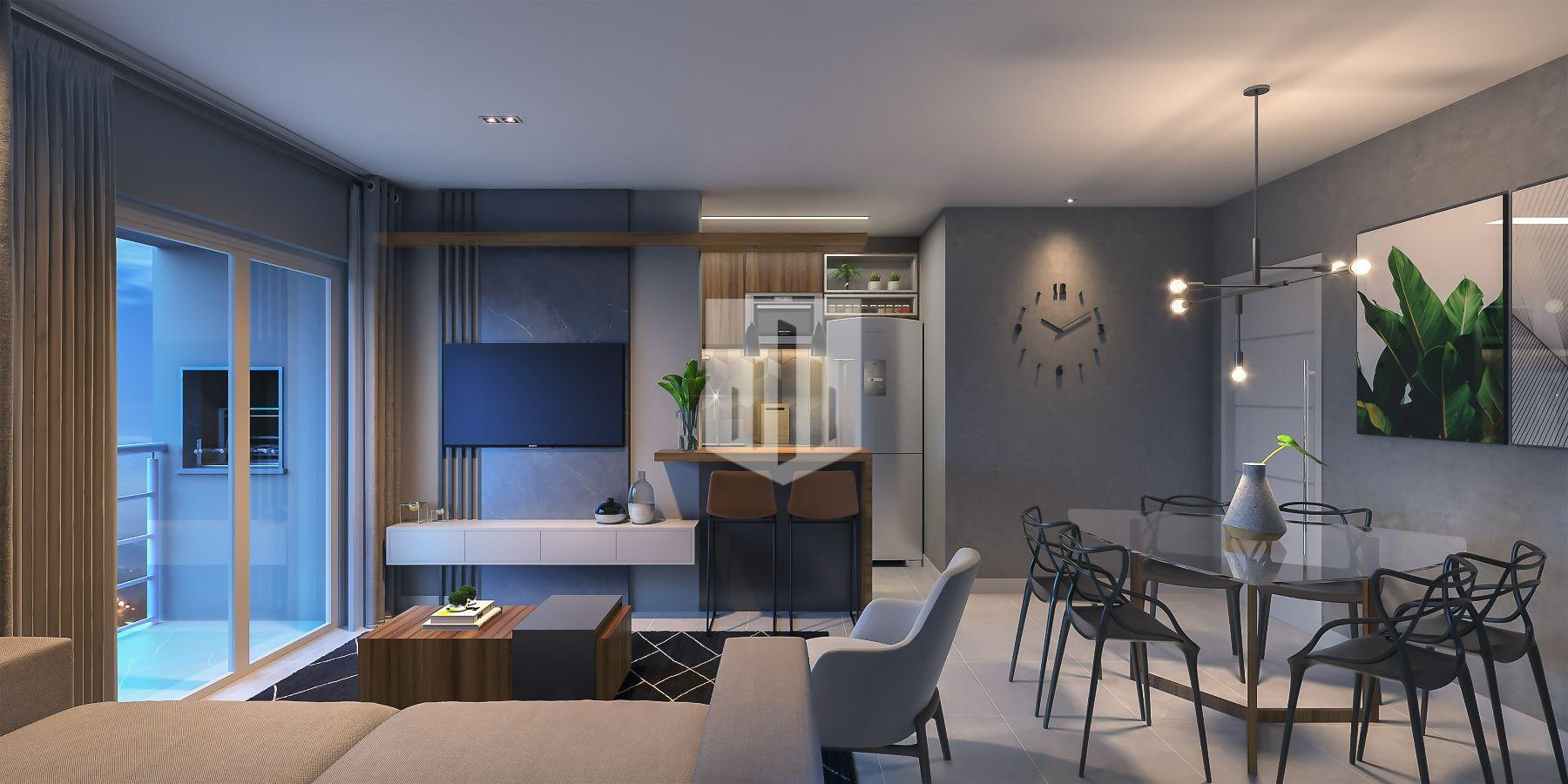 Apartamentos com área privativa de até 59,99m², divididos em dois dormitórios, um banheiro social, sala de estar, jantar e cozinha em ambientes integrados, área de serviço, sacada com churrasqueira e uma vaga de estacionamento.
