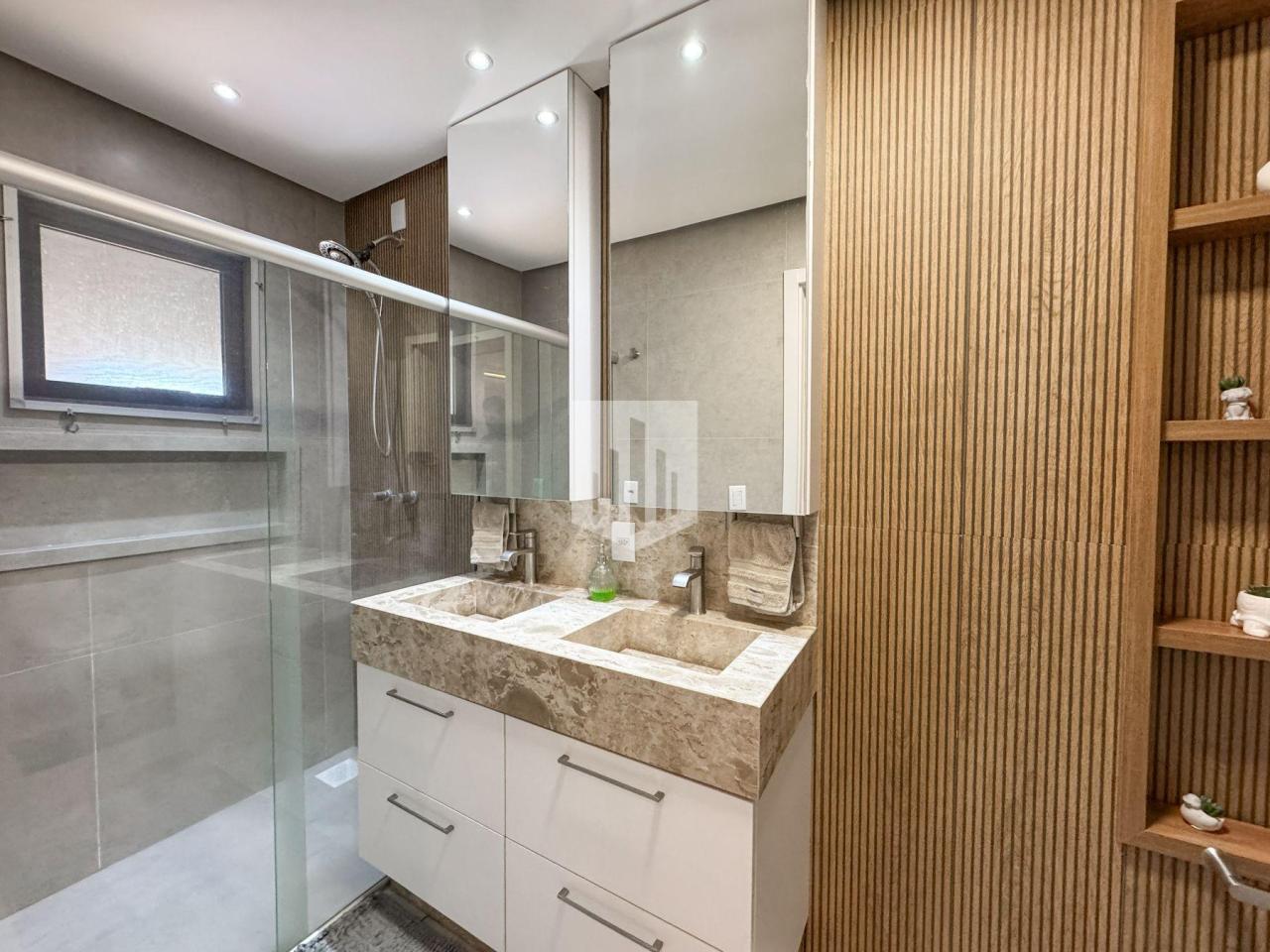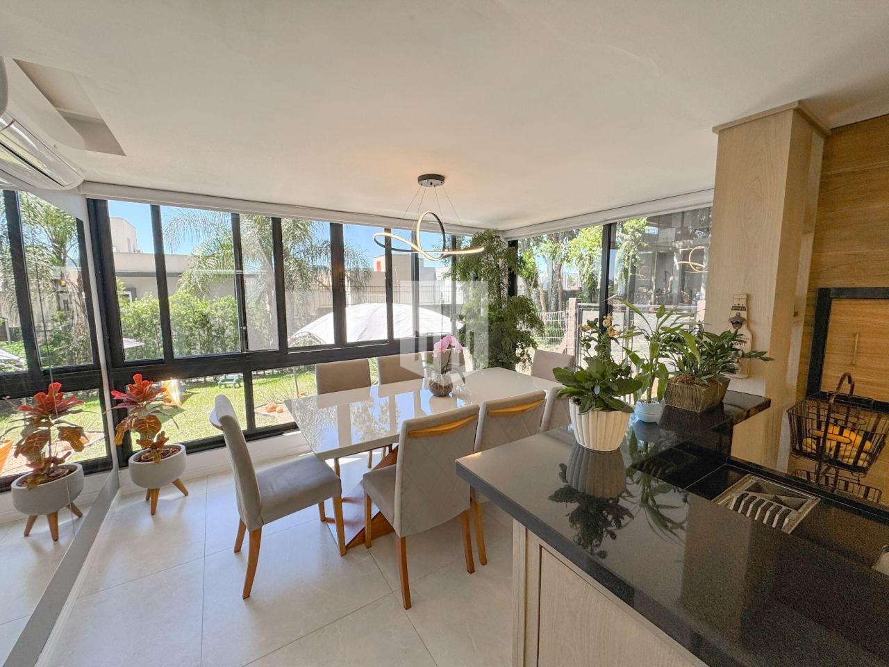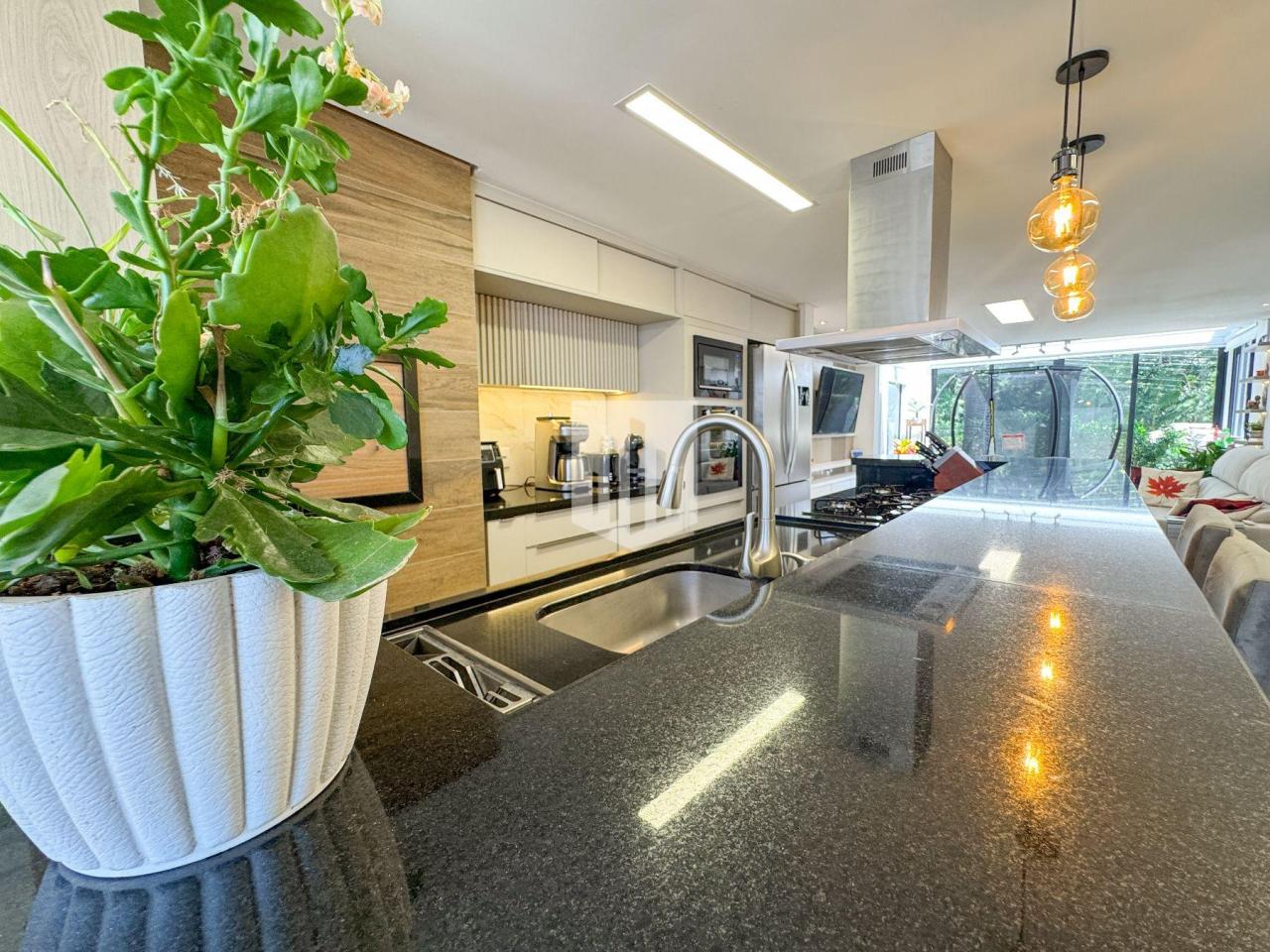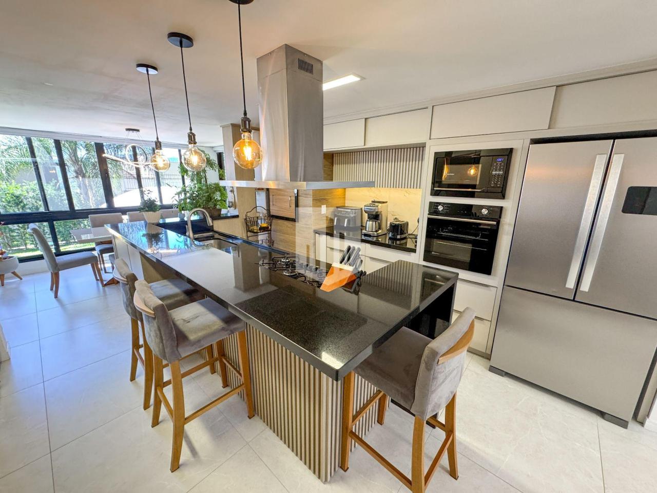 A cozinha é outro destaque. Equipada com ilha central em granito, armários planejados, churrasqueira e iluminação pendente, combina funcionalidade com um toque moderno. Dela, é possível ter uma visão completa da área social e do pátio, trazendo praticidade e integração entre os espaços. Um ambiente ideal para quem gosta de cozinhar enquanto acompanha o movimento da casa e das crianças.